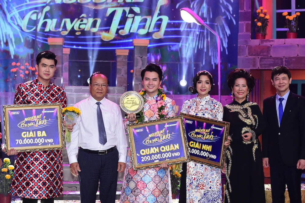 Quán quân, á quân và giải ba Người kể chuyện tình cùng hai giám khảo Phương Dung - Thái Châu và ông Lê Quang Nguyên, Giám đốc Đài Truyền hình Vĩnh Long