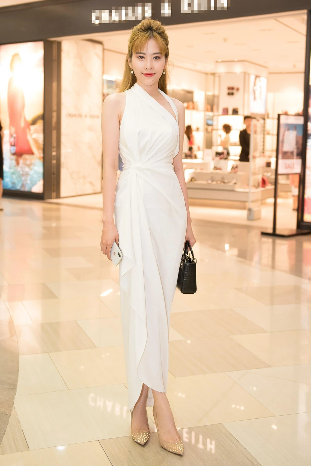 Diện bộ váy trắng với điểm xuyến nhẹ nhàng tại eo, Nam Em còn khéo léo khi đôi chân dài miên man. Tone trang điểm nhẹ nhàng của người đẹp đi cùng phụ kiện ton-sur-ton với bộ váy trắng. Và không chỉ thay đổi ngoại hình, người đẹp còn thay đổi cả mái tóc đen bấy lâu nay.