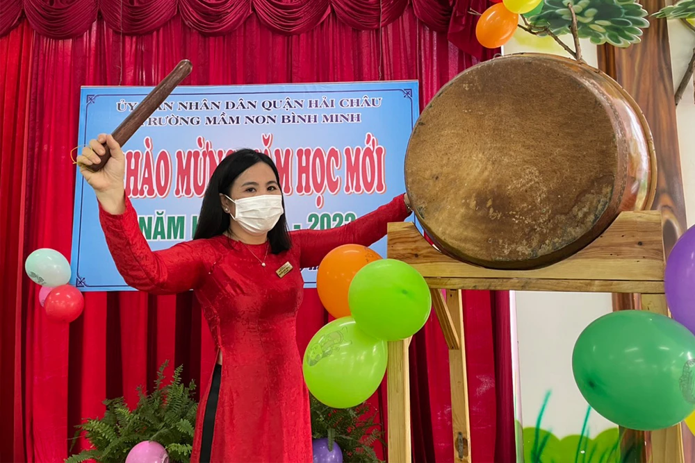 Cô Nguyễn Quốc Thư Trâm đánh trống khai trường bắt đầu năm học mới.