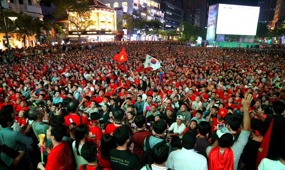 CĐV tiếp lửa từ xa cho đội tuyển Việt Nam trên phố đi bộ Nguyễn Huệ. Ảnh: HOÀNG GIANG