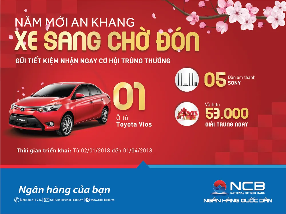 Đặc biệt, phần thưởng dành cho 6 khách hàng may mắn nhất là 1 xe ô tô Toyota Vios 1.5E MT và 5 dàn máy Bluray Sony BDV E6100/msp1. Mọi thông tin chi tiết, khách hàng vui lòng liên hệ tại các Chi nhánh và điểm giao dịch của NCB trên toàn quốc. Hotline (0283) 821.6216; Email: callcenter@ncb-bank.vn; Website: www.ncb-bank.vn.