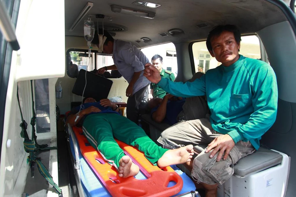 Một ngư dân được xe cấp cứu đưa ngay đến bệnh viện sau khi tàu cập bến. Ảnh: HẢI HIẾU