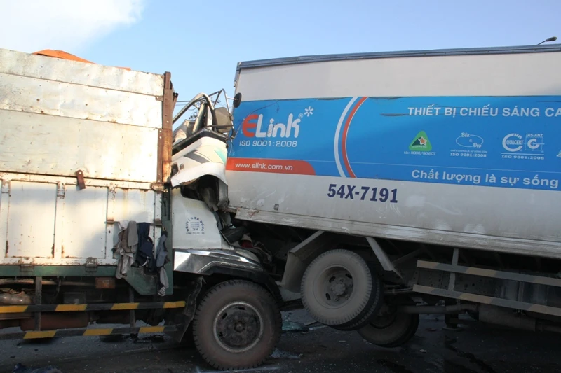 Theo đà, một ô tô Toyota 16 chỗ bị tông đã lao tới trước đâm vào hai chiếc xe tải. Ngay lúc đó một chiếc Inova 7 chỗ từ phía sau trờ tới không thắng kịp, tiếp tục đâm vào đuôi xe tải. Tổng cộng có bảy chiếc xe, trong đó năm xe tải tông liên hoàn vào nhau, nhiều xe phần đầu bị bẹp dúm, dính chặt vào xe khác.
