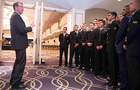 Bộ trưởng Quốc phòng Ashton Carter trò chuyện với các học viên trường hải quân ngày 1-3 ở San Francisco. Ảnh: BỘ QUỐC PHÒNG MỸ