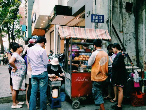 Xe bánh mì gần 80 năm ở đường Huỳnh Khương Ninh, quận 1 hút khách mỗi ngày với pate nhà làm rất ngon. Trước đây quán chỉ bán buổi chiều, vài năm gần đây đã bán thêm buổi sáng để đáp ứng nhu cầu của khách. Ảnh: Khánh Ly.