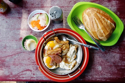 | Đặc trưng của quán là món bánh mì chảo. Bên trong chảo là đủ thứ nguyên liệu như trứng gà ốp la, thịt nguội, xúc xích, chả cá, chả lụa... Tất cả đều được chiên nóng cháy cạnh cùng ít hành tây và dùng nóng với bánh mì. Nếu không thích dùng ốp la, bạn có thể gọi một phần thịt nguội thập cẩm riêng, rắc lên ít tiêu, nước tương, tương ớt. Giá trung bình một phần bánh mì ăn kèm trứng trên chảo là40.000 - 45.000 đồng. Ảnh:Phong Vinh. Theo Thanh Tuyết (Vnexpress) |
