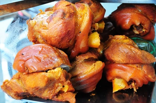 Thịt đùi heo phá lấu được xắt miếng mỏng cho bánh cùng patê gan, bơ, nước tương, muối ớt và các loại nguyên liệu khác. Pate, dưa chua cũng do các thế hệ của chủ quán tự làm. Giá mỗi ổ bánh mì phá lấu đùi heo là 15.000 đồng. Ảnh: Thiên Chương.