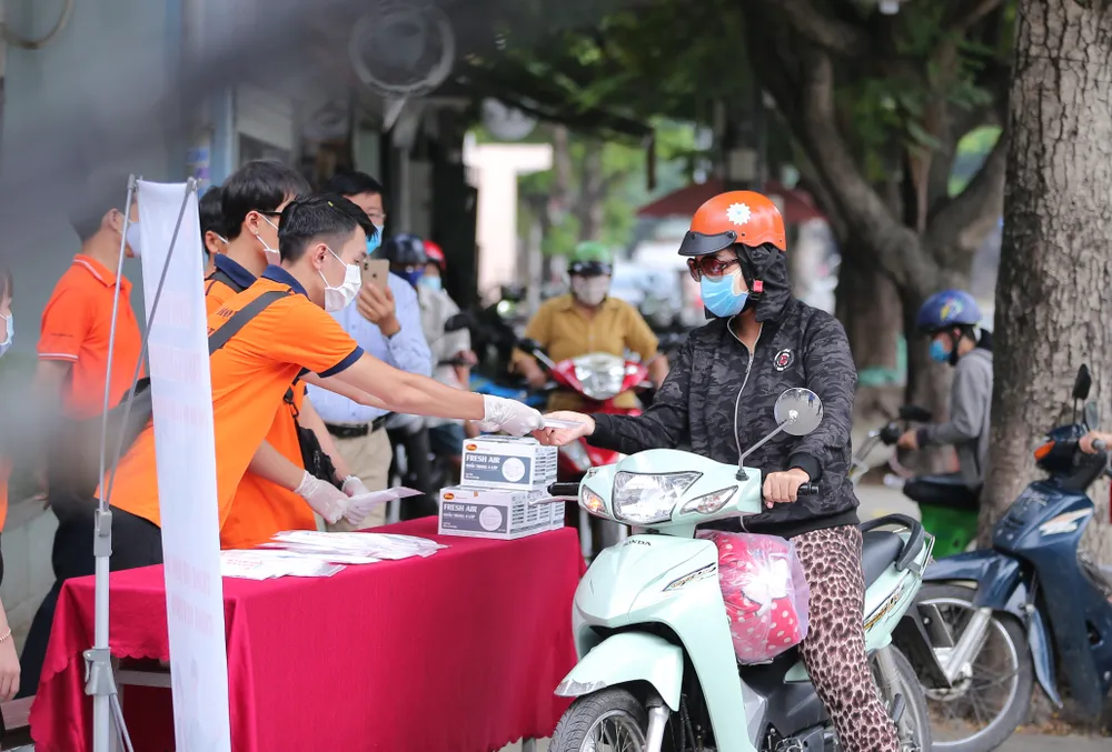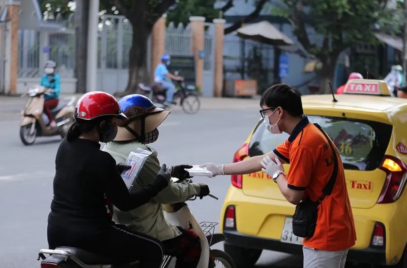 Thầy trò trường ĐH Lạc Hồng phát tặng khẩu trang cho sinh viên, người đi đường. Ảnh: PA