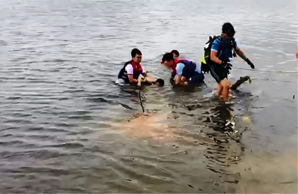 Lực lượng chức năng đưa thi thể nam sinh vào bờ. Ảnh: HẢI HIẾU