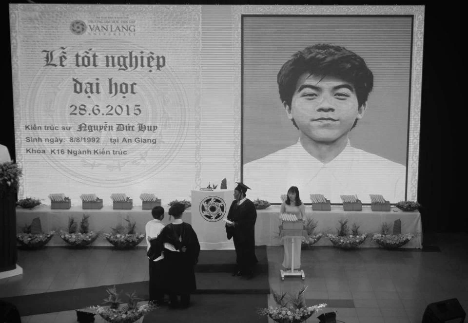 Trang Fanpage Kiến Xây tivi đã thuật lại câu chuyện cảm động này: "Khi tên của tân Kiến trúc sư Nguyễn Đức Huy được xướng lên, hình ảnh của bạn xuất hiện tại màn hình, cả hội trường im lặng đầy trân trọng. Người lên nhận bằng là đại diện của gia đình - ba của bạn Huy. Giây phút ông nhận tấm bằng từ trường, nhận lời chia buồn sâu sắc từ thầy Hiệu trưởng đầy quyến luyến và bịn rịn, cả hội trường đây đó nhiều bạn không cầm được nước mắt vì hình ảnh cảm động này...