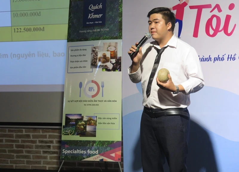 Em Thành Gia đang trình bày dự án về những sản phẩm từ trái quách của mình.