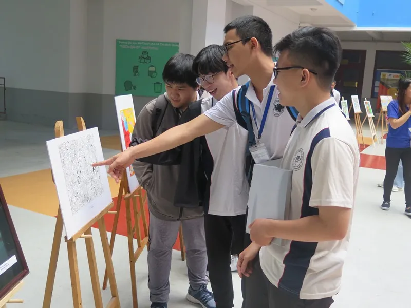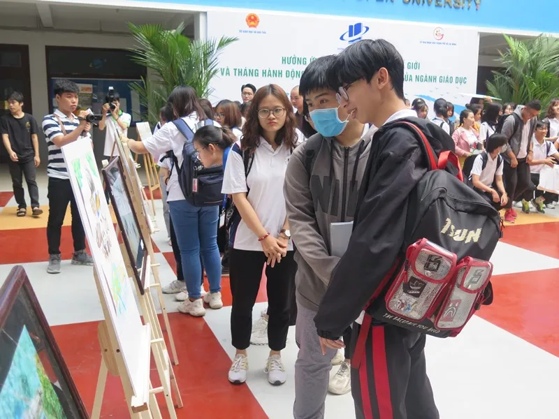 Đông đảo sinh viên tham quan những bức tranh vẽ về chủ đề bảo vệ môi trường sau buổi lễ phát động