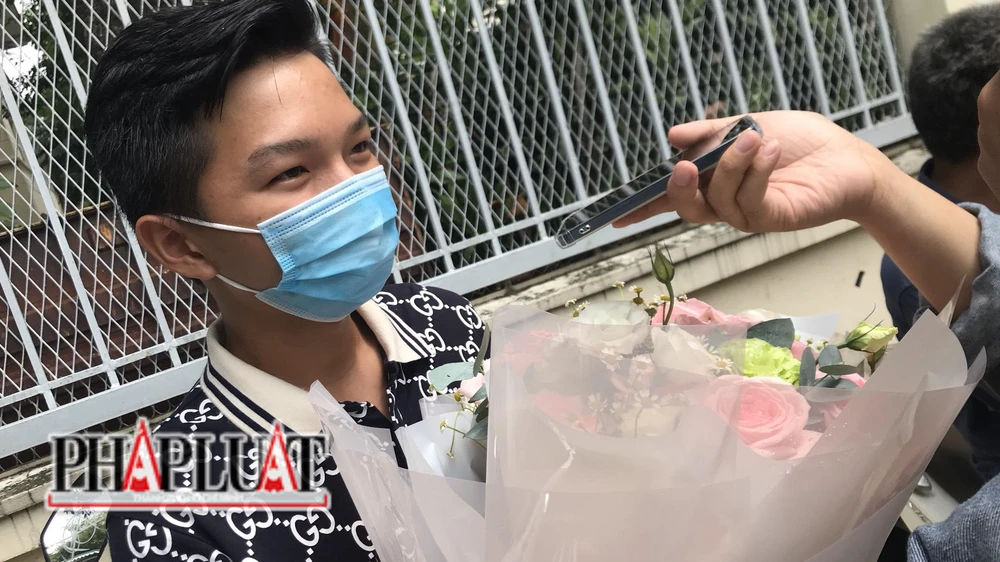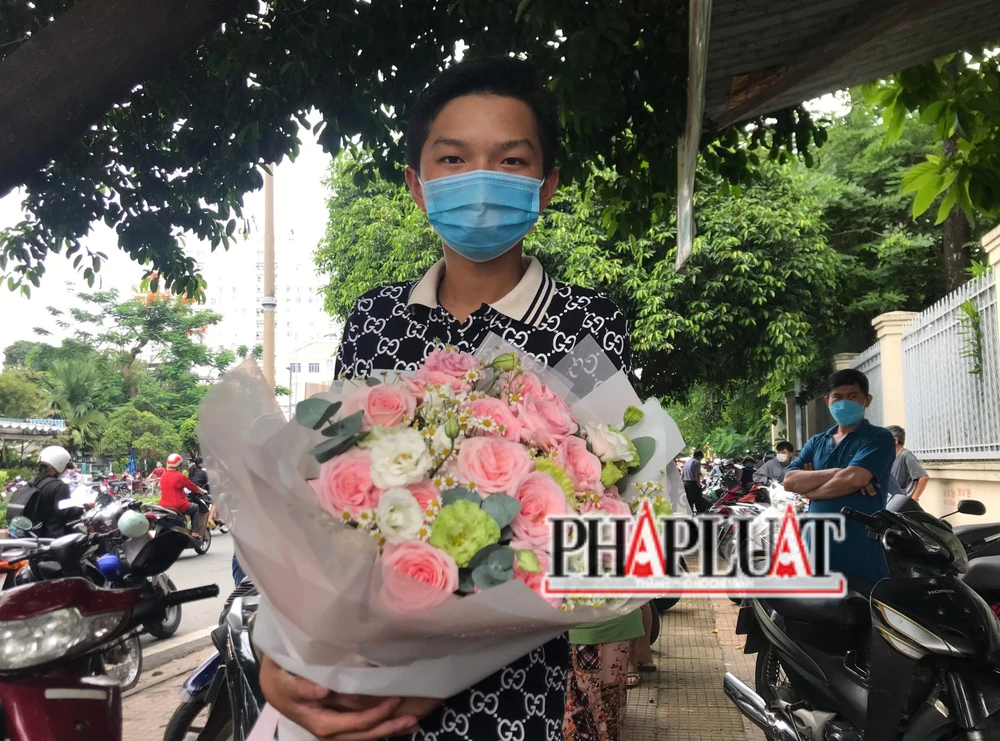 Đứng trước điểm thi đợi bạn gái, em NMK hiện là HS trường THPT Trương Vĩnh Ký cầm trên tay bó hoa hồng đến tặng cho bạn gái của mình. Hành động của chàng trai đã khiến không ít phụ huynh đang có mặt ở điểm thi trầm trồ.