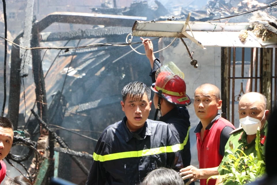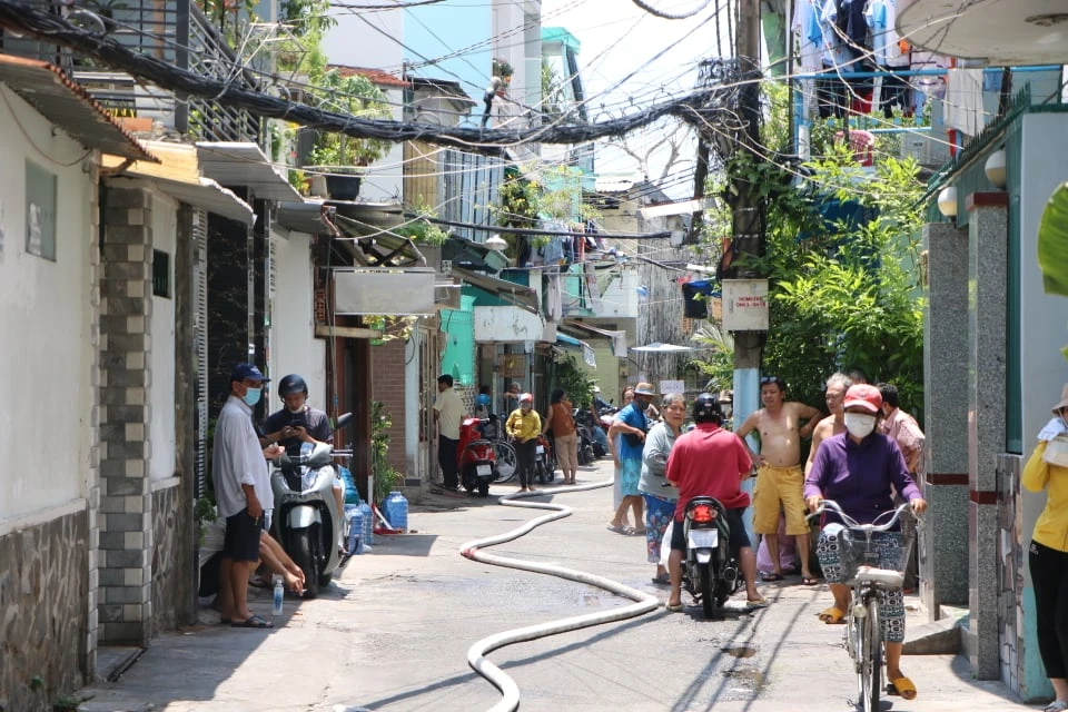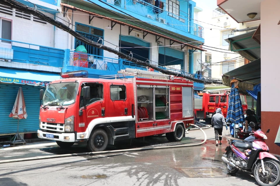 Do vụ cháy nằm sâu bên trong hẻm nhỏ, phương tiện chữa cháy không thể tiếp cận nên cảnh sát phải đưa dây dẫn nước hàng trăm mét để phun nước dập lửa và khống chế đám cháy.