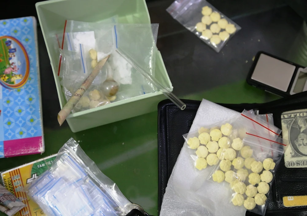 Lục soát tại phòng khách, công an thu giữ thêm tám gói ma túy đá và Ketamin (khoảng 30 gam) và 59 viên thuốc lắc. Một số dụng cụ dùng để sử dung ma túy tại phòng ngủ.
