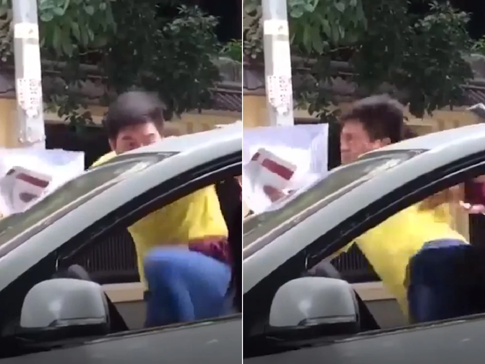 Khi người phụ nữ dừng xe ở khu vực trên thì bất ngờ một nam thanh niên mặc áo màu vàng tiến lại mở cửa xe. Sau đó, người này đã đạp liên tiếp vào nữ tài xế đang ngồi bên trong. Những người chứng kiến không hiểu lý do gì?