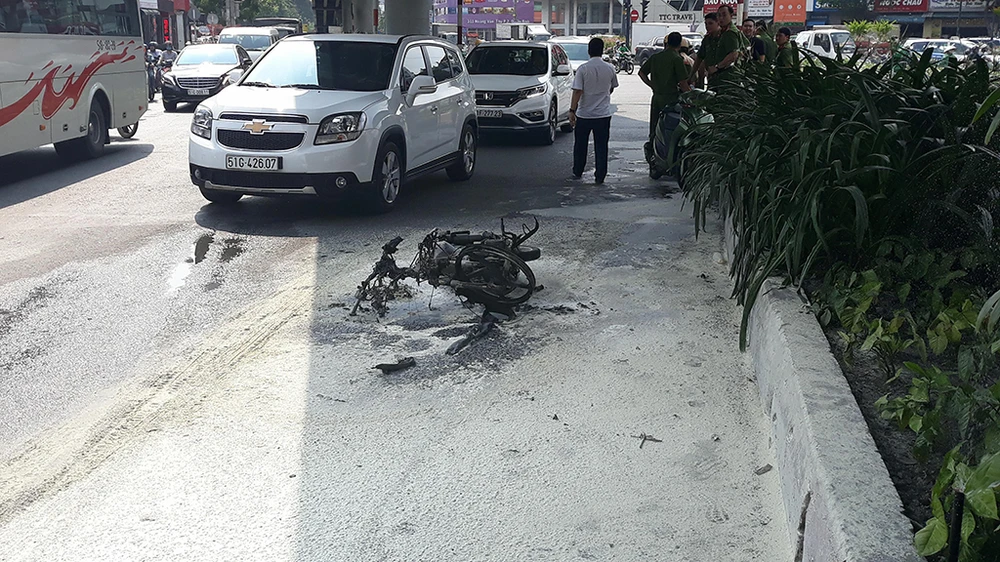 Lực lượng chức năng tại chỗ huy động bình cứu hỏa chữa cháy. Lửa được dập tắt sau ít phút nhưng chiếc xe chỉ còn bộ khung.