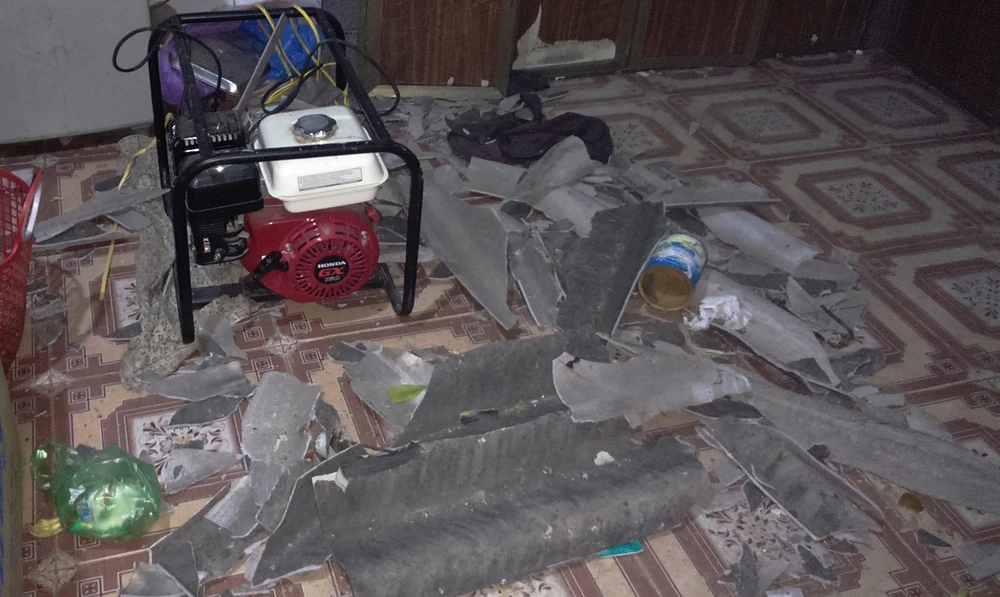 Hiện trường vụ nổ khiến mái broximăng cùng nhiều vật dụng trong nhà hư hỏng. Ảnh: Phạm Xuân