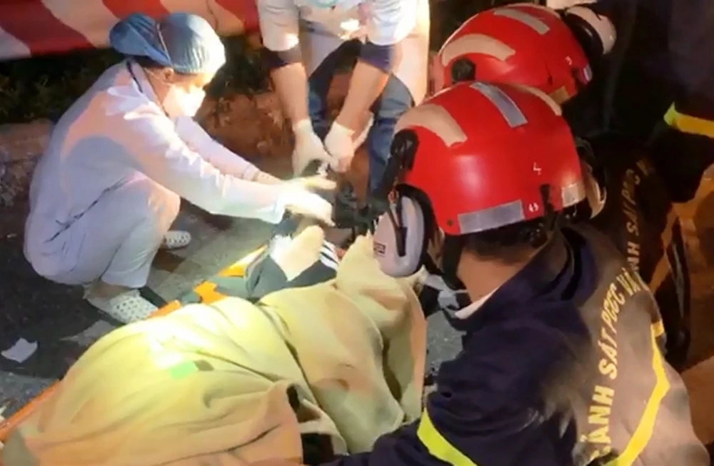 Nạn nhân bị gãy chân, các bác sĩ đang nẹp cố định trước khi đưa đến bệnh viện. Ảnh: HH