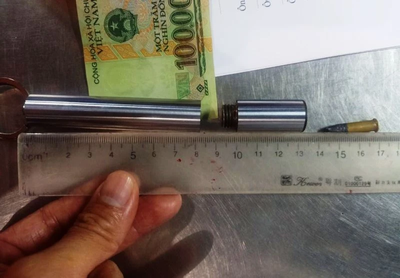 Công an phát hiện trên người của Phúc có hai gói ma túy đá và cân tiểu ly. Phúc còn thủ sẵn trong người một súng bút có một viên đã lên nòng.