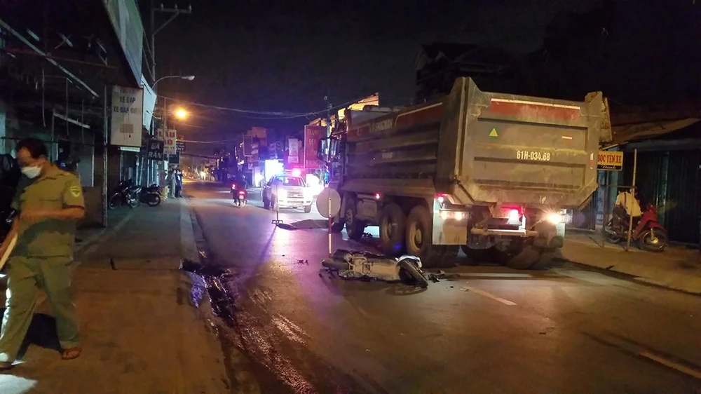 Tại hiện trường, nam thanh niên ngoài 20 tuổi chạy xe máy được người dân phát hiện tử vong trước đầu xe ben biển số tỉnh Bình Dương.