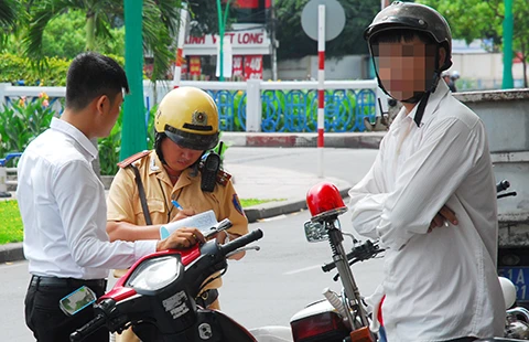 CSGT đang lập biên bản người vi phạm an toàn giao thông. Ảnh: HTD