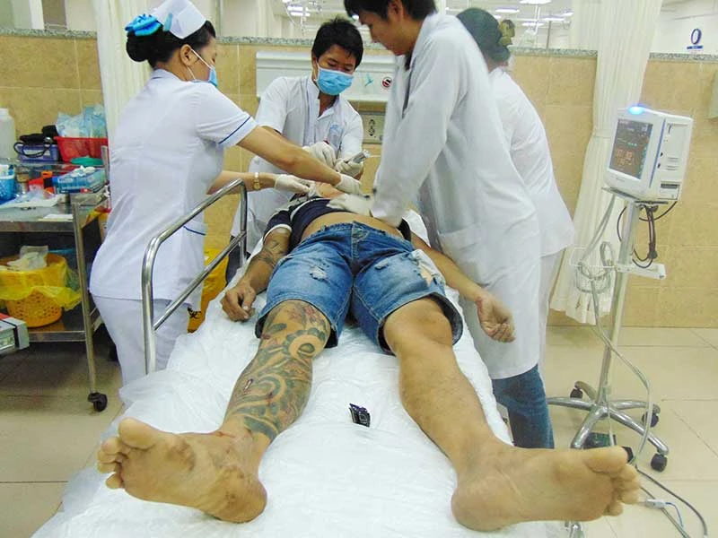 Trước đó, khoảng 23 giờ một ngày giữa tháng 10-2016, khoa Cấp cứu BV Đa khoa Bình Dương tiếp nhận một nạn nhân máu me đầy người do xô xát, mình mẩy xăm chằng chịt.