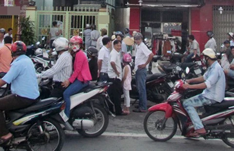 Người dân hiếu kỳ đến xem công an khám nghiệm hiện trường chị D. bị cướp. Ảnh: T.VŨ