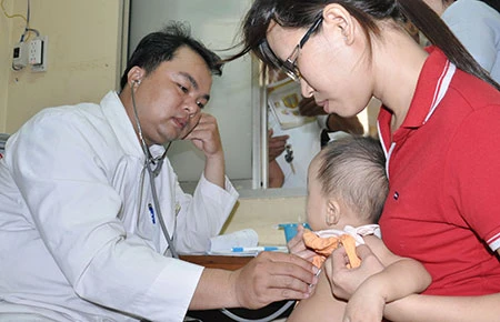 Khám trước tiêm vaccine cho trẻ tại Trạm Y tế Vĩnh Lộc A, huyện Bình Chánh. Ảnh: TÙNG SƠN