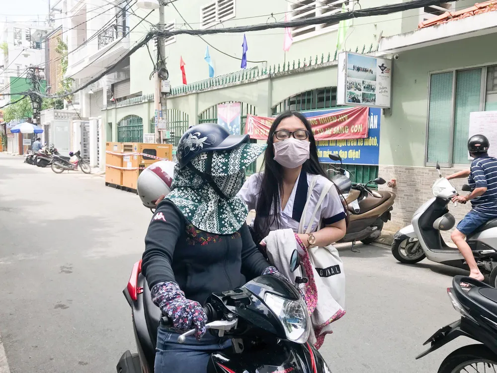 Phụ huynh TP.HCM đưa con đi thi che chắn kín mít để chống nóng. Ảnh: Phan Yên