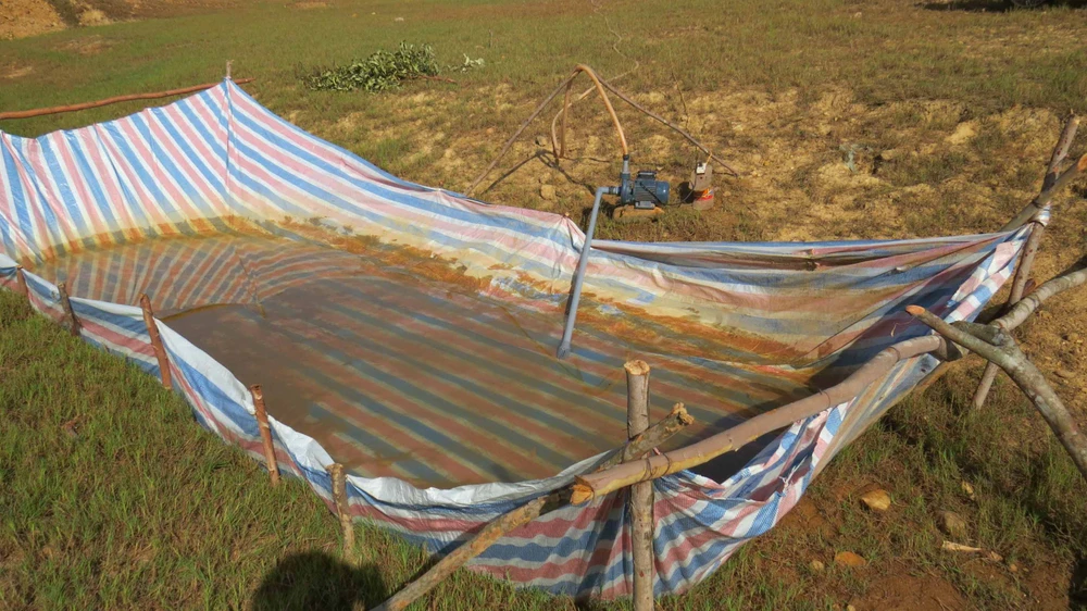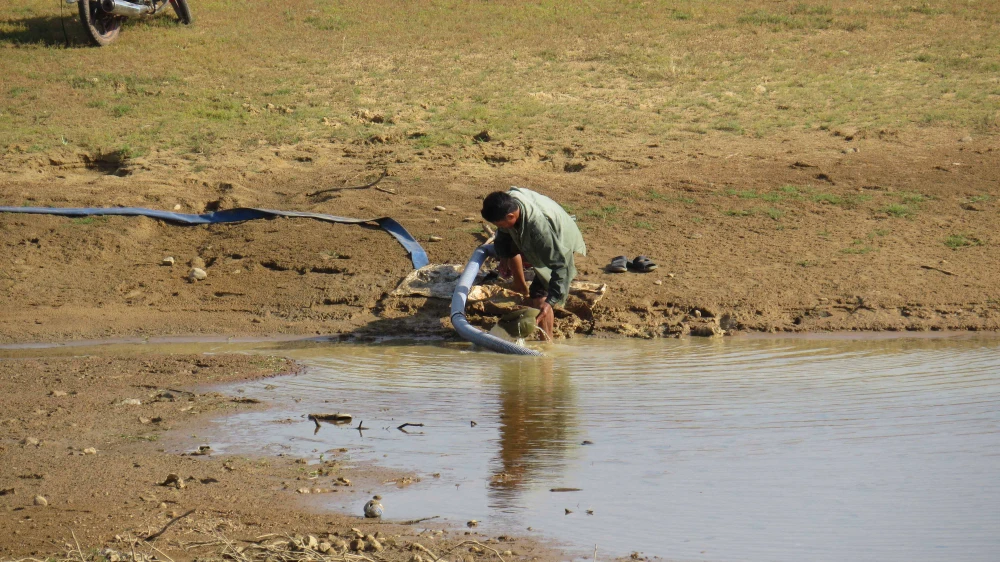 Người dân mót nước trong hồ chứa Quảng Lưu còn nước cặn.