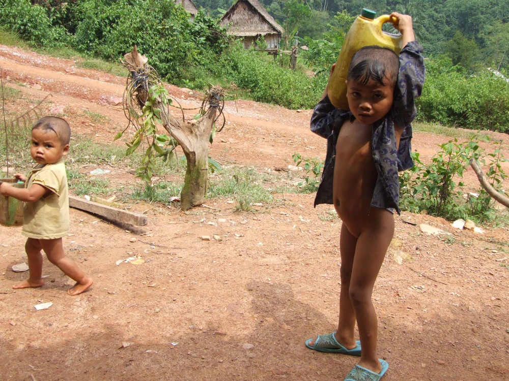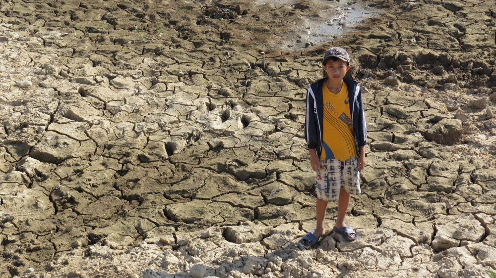 Trong một vũng nước trẻ con đi lại trên đất nứt nẻ.