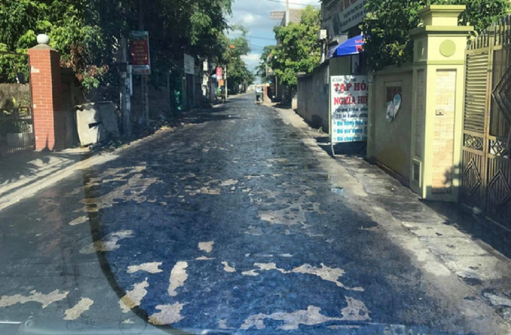 Hình ảnh đăng tải cho thấy bề mặt đoạn đường xuất hiện nhiều vết loang lổ do lớp nhựa trải bên trên bị chảy ra thành từng mảng. Sự việc gây không ít khó khăn cho việc đi lại của người dân trong thôn, nguyên nhân được cho là do thời tiết quá nóng.
