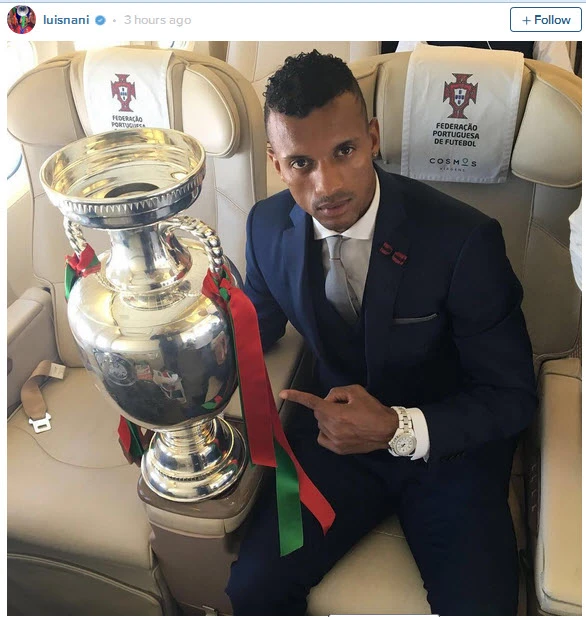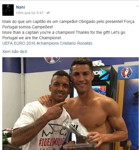 Trước khi chia tay nước Pháp về lại quê nhà với chiếc cúp vàng Euro. Nani đã khoe một bức ảnh trên trang cá nhân của mình với lời chia sẻ trong sung sướng vì anh được đội trưởng Ronaldo tặng chiếc giày bạc Euro cho mình: