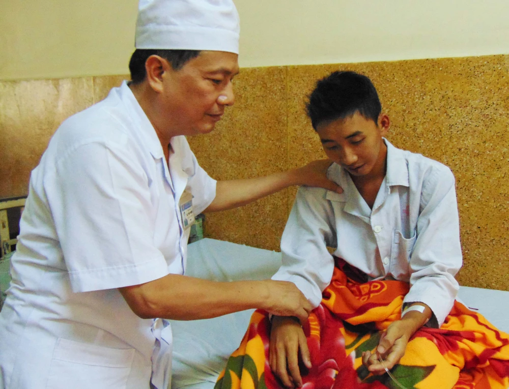 Bác sĩ Nguyễn Tuấn Phương đang kiểm tra sức khỏe cho anh Giang. Ảnh: TRẦN NGỌC