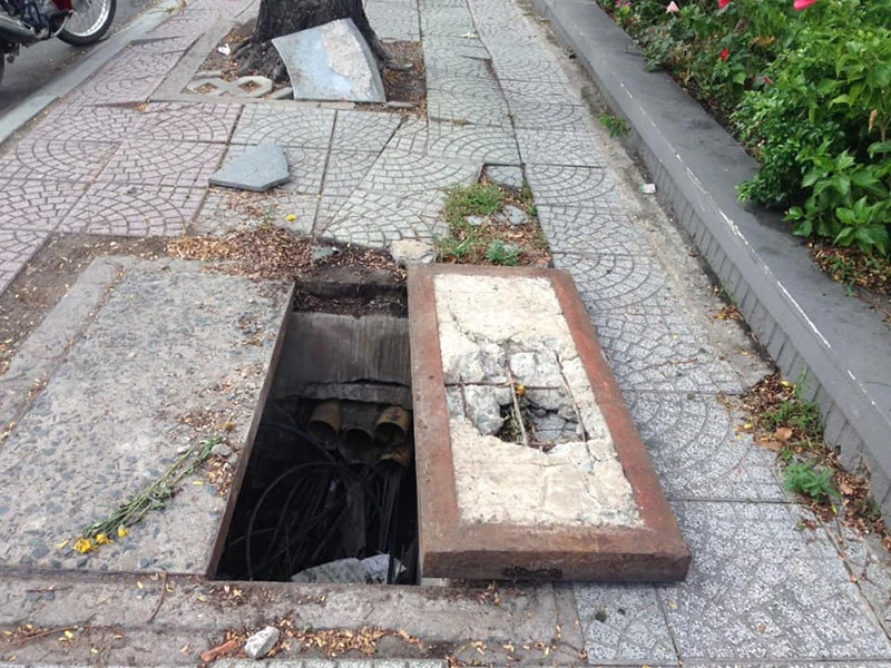 Nắp hố ga mở để trống, không có vật che chắn, cảnh báo nên rất nguy hiểm cho người dân đi bộ trên vỉa hè.
