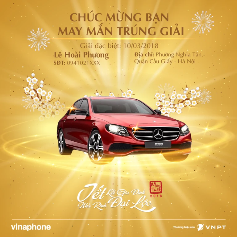 Với giải đặc biệt, chị sẽ nhận giải thưởng là ô tô Mercedes E250 trị giá gần 2,5 tỉ đồng. Trước đó, VinaPhone đã trao thưởng 45 giải ngày là xe máy SH 125cc trị giá gần 70 triệu đồng/xe cho những khách hàng may mắn khác.