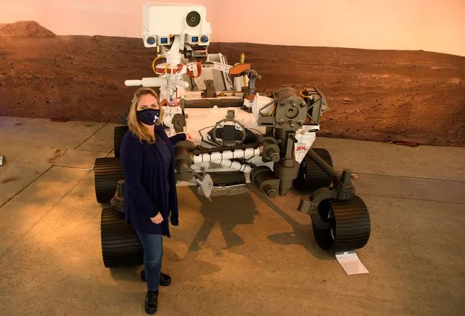 Phó quản lý dự án Perseverance, bà Jennifer Trosper chụp ảnh với mô hình tàu Perseverance. Ảnh: NASA