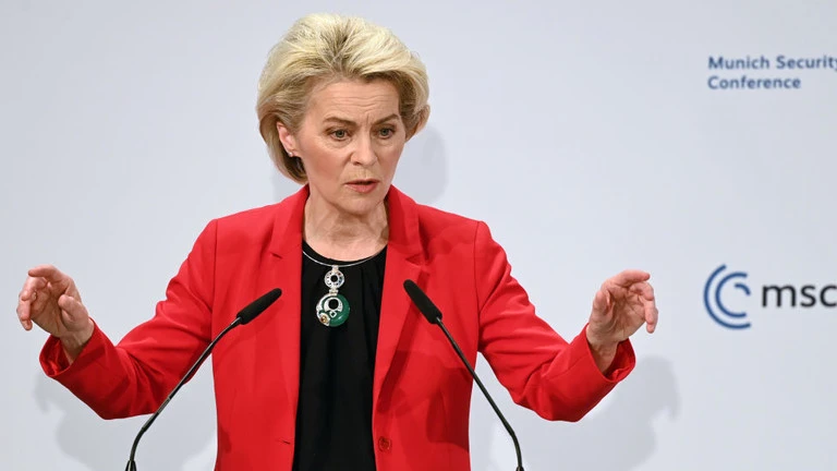 Chủ tịch Ủy ban châu Âu Ursula von der Leyen phát biểu tại Hội nghị An ninh Munich ở Đức, ngày 19-2. Ảnh: RT