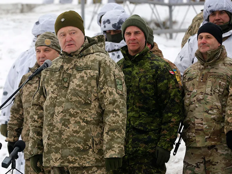 Tổng thống Ukraine Petro Poroshenko (thứ hai từ trái sang) phát biểu trước binh sĩ Ukraine trong cuộc tập trận ở căn cứ quân sự Honcharivske, vùng Chernihiv (Ukraine) ngày 3-12. Ảnh: AP