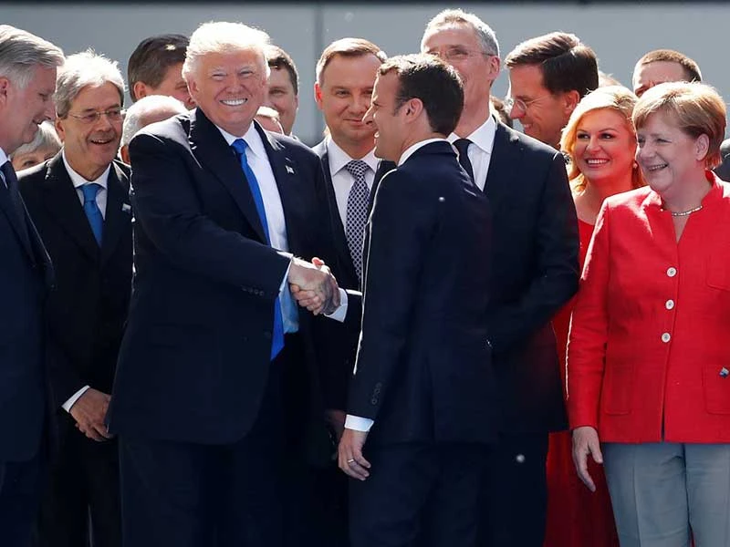 Tổng thống Mỹ Trump bắt tay Tổng thống Pháp Emmanuel Macron cùng các lãnh đạo thành viên NATO ngày 25-5. Ảnh: REUTERS