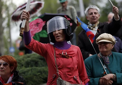 Người biểu tình thân Nga diễu hành trước cửa văn phòng công tố Donetsk - Ảnh: Reuters