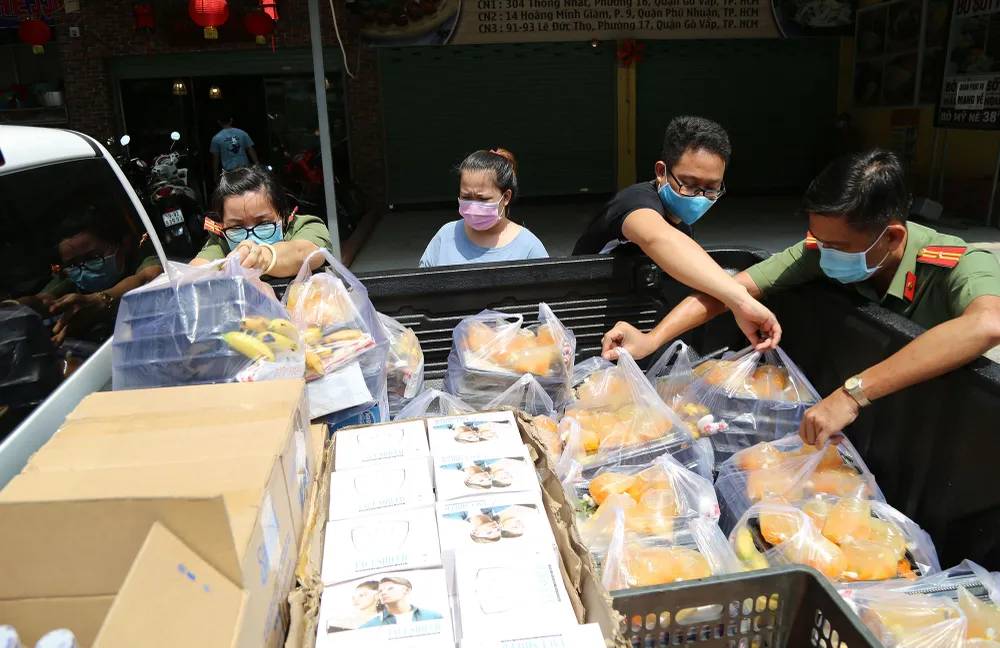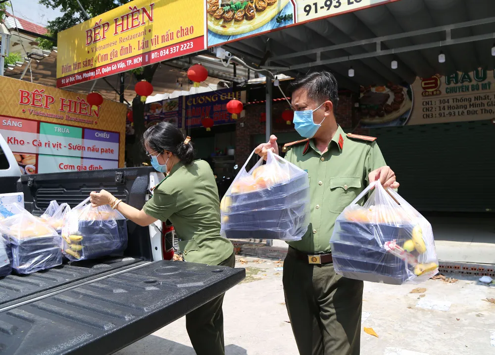 Khoảng 10 giờ, xe của công an quận Gò Vấp chạy đến tận nhà hàng để nhận các phần cơm, sau đó chia cho từng chốt trực cửa ngõ ra vào quận.
