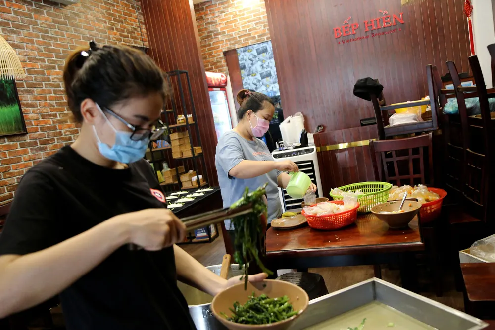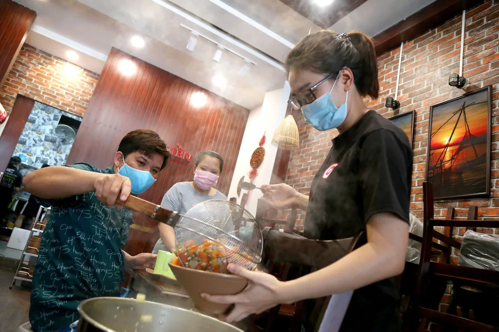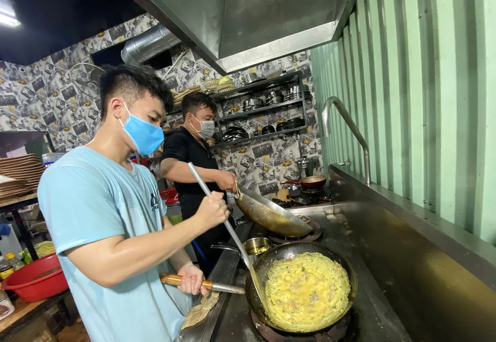 Dù đang trong thời gian giãn cách xã hội nhưng gian bếp nhà hàng của anh Phạm Minh Hiền nằm trên đường Lê Đức Thọ (phường 17, quận Gò Vấp, TP.HCM) vẫn luôn rực lửa.