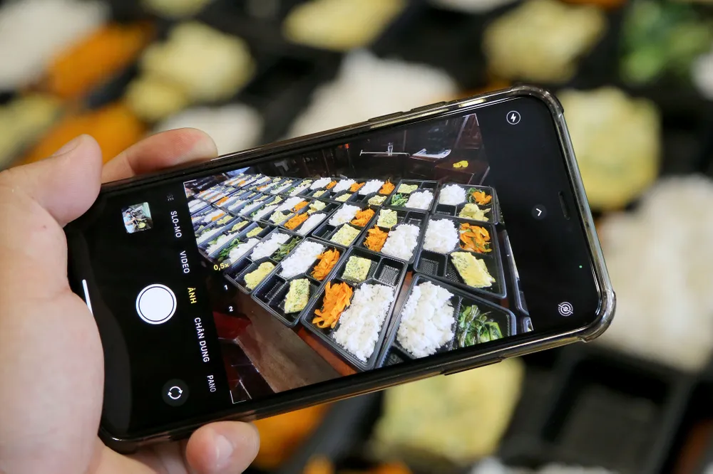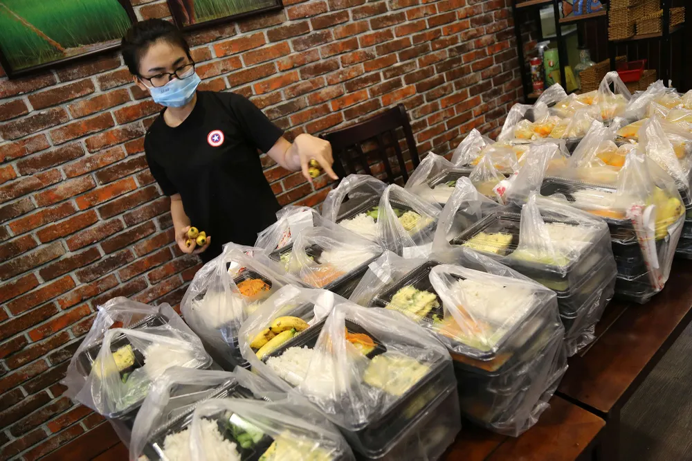 Mỗi bịch gồm 5 phần ăn, nhân viên của quán kiểm tra một lượt các phần ăn đã đủ đũa, muỗng hay trái cây tráng miệng.