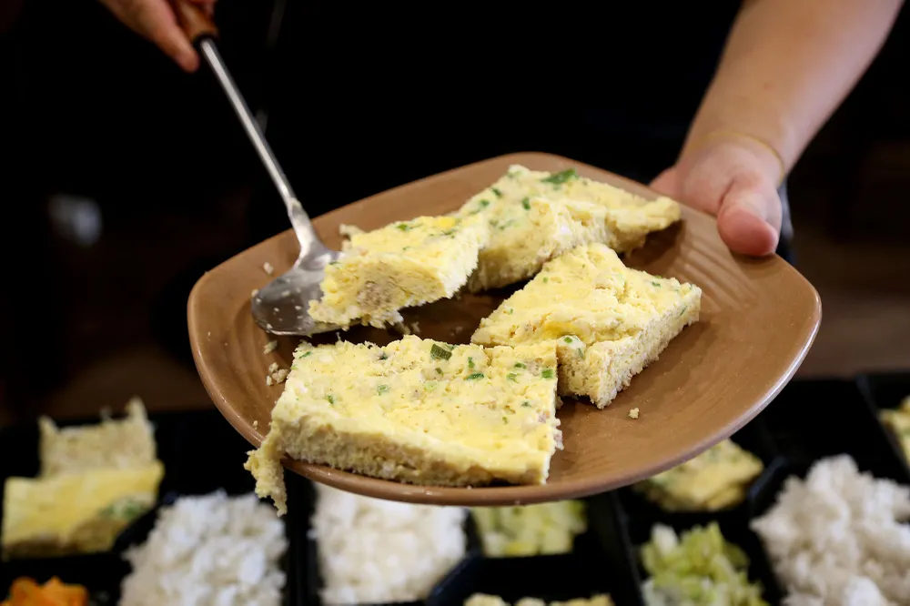 "Sao phần cơm này lại ít trứng quá, sao mọi người ăn no?"...- anh Hiền nói với nhóm. Lát sau những phần trứng hấp thơm lừng được bổ sung ngay lập tức.