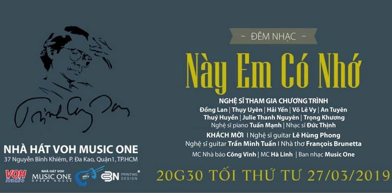 Vào lúc 20 giờ tối nay, 27-3, tại Nhà hát VOH Music One, số 37 Nguyễn Đình Chiểu, P Đa Kao, Q.1, TP.HCM sẽ diễn ra đêm nhạc Này em có nhớ để tưởng nhớ 18 năm ngày mất của nhạc sĩ Trịnh Công Sơn. Đêm nhạc không chú trọng hiệu ứng sân khấu, không trình diễn cầu kỳ, chương trình là những khúc tự tình, những dòng tâm sự, những hồi ức đan xen cùng những ca khúc nhạc Trịnh được thể hiện với dàn nhạc acoustic rất mộc .