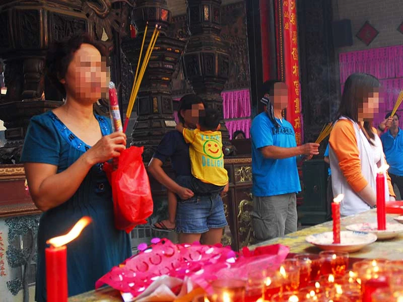 Ngay cả dân mình vào nơi tôn nghiêm cũng ăn mặc không lịch sự thì khó tạo nền nếp để tác động tới du khách. Trong ảnh: Một phụ nữ diện quần short khi vào chùa. Ảnh: HTD