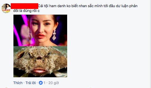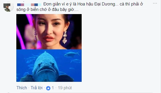 Thế nhưng ngay dưới dòng trạng thái (status) này của ca sĩ Thanh Thảo vẫn có một “nam nhân” vào phản hồi (comment) “Cái tội ham danh không biết nhan sắc mình tới đâu dư luận phản đối là đúng rồi chị” kèm hình ảnh tân hoa hậu ghép với cá.