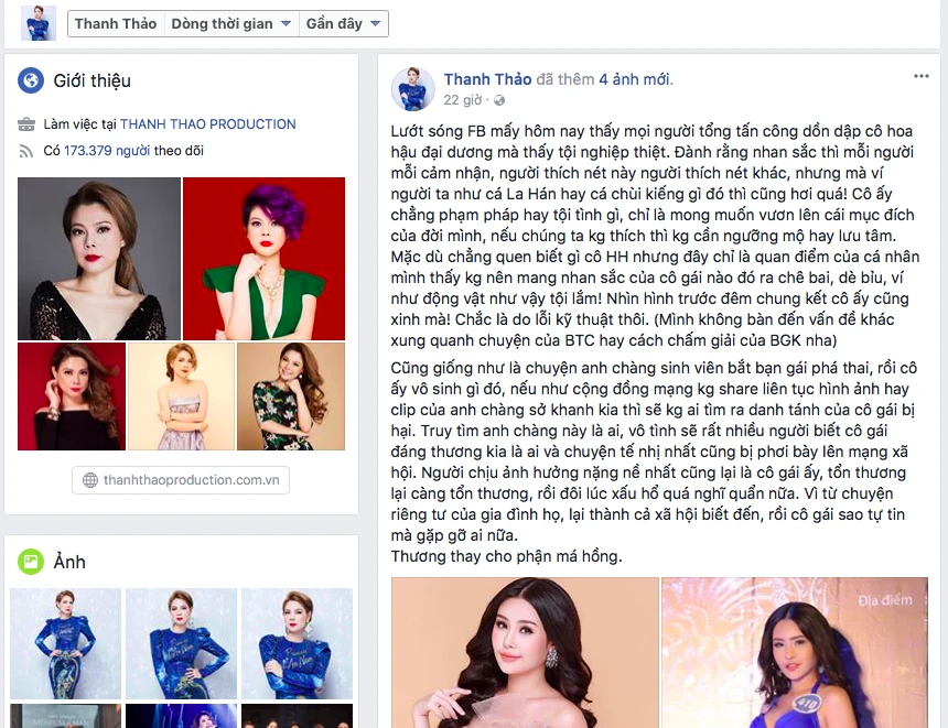 Trên Facebook cá nhân, ca sĩ Thanh Thảo viết rất rõ:“Lướt sóng facebook mấy hôm nay thấy mọi người tổng tấn công dồn dập cô hoa hậu đại dương mà thấy tội nghiệp thiệt. Đành rằng nhan sắc thì mỗi người mỗi cảm nhận, người thích nét này người thích nét khác nhưng mà ví người ta như cá La Hán hay cá chùi kiếng gì đó thì cũng hơi quá! Cô ấy chẳng phạm pháp hay tội tình gì, chỉ là mong muốn vươn lên cái mục đích của đời mình, nếu chúng ta không thích thì không cần ngưỡng mộ hay lưu tâm. Mặc dù chẳng quen biết gì cô hoa hậu nhưng đây chỉ là quan điểm của cá nhân mình thấy không nên mang nhan sắc của cô gái nào đó ra chê bai, dè bỉu, ví như động vật như vậy tội lắm! Nhìn hình trước đêm chung kết cô ấy cũng xinh mà! Chắc là do lỗi kỹ thuật thôi. (Mình không bàn đến vấn đề khác xung quanh chuyện của Ban tổ chức hay cách chấm giải của Ban giám khảo nha) […] Thương thay cho phận má hồng!”
